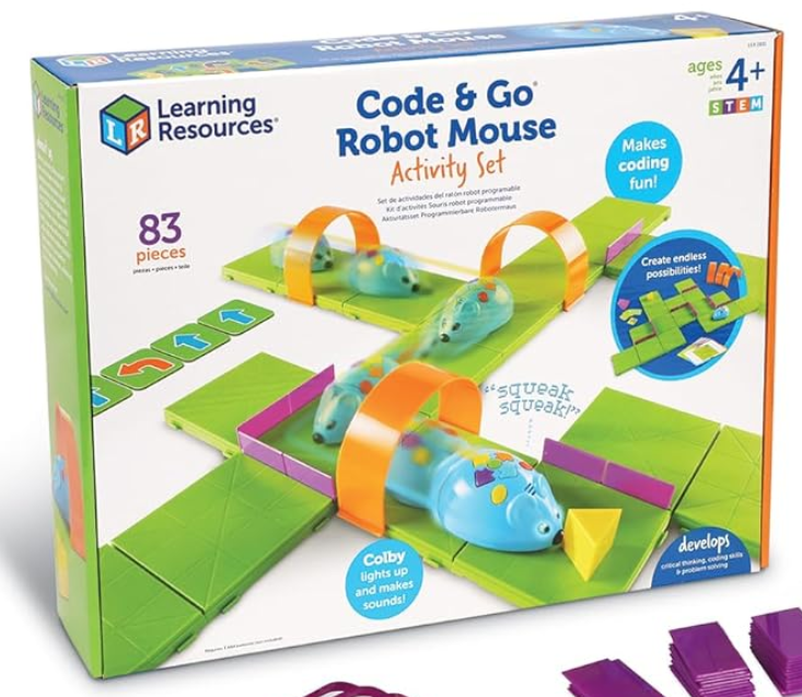 Kids program “Maurice” the mouse to navigate self-built mazes using simple button commands. This toy introduces sequencing, debugging, and cause-and-effect thinking in a playful, approachable way. Building new mazes adds endless variation and creativity, making coding concepts tangible and fun.